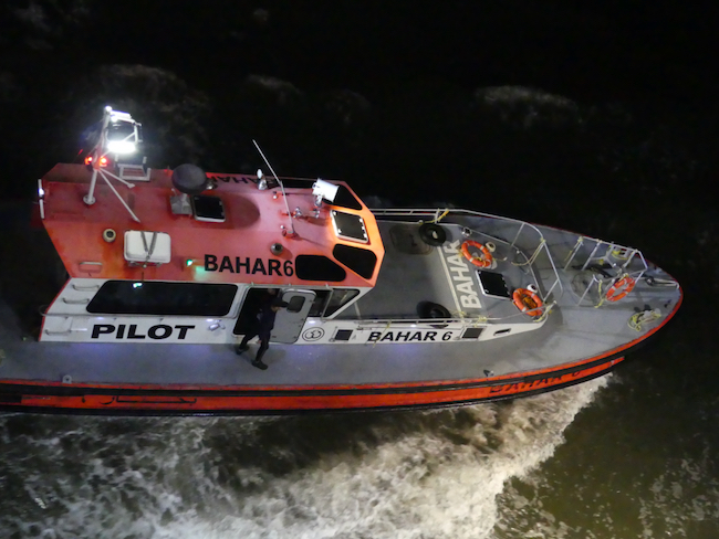 I had set my alarm for 3:47 am. but I didn’t even need it, I was so eager, I woke up at 3:30 am. Out on the balcony, I discovered we were moving, and the pilot boat came up and dropped off the Canal Pilot as I was watching.