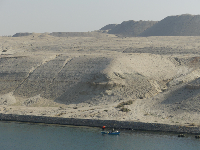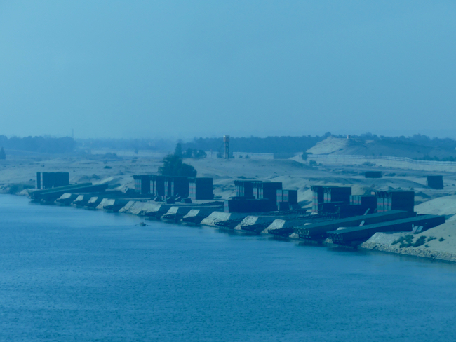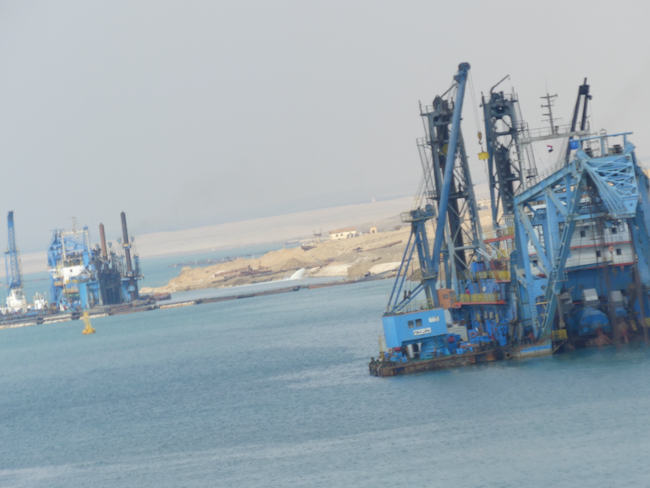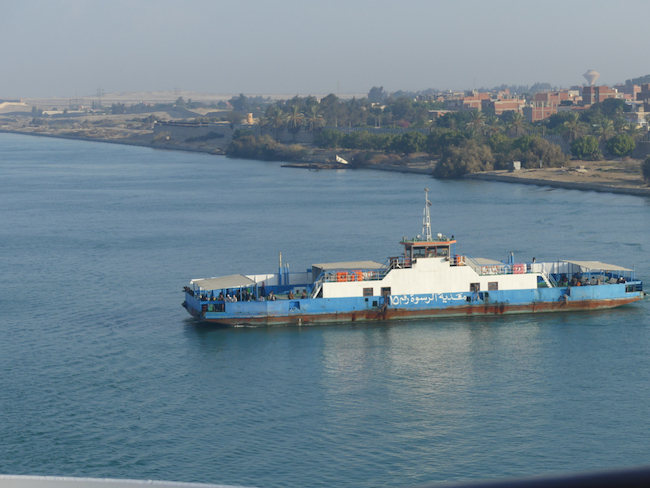 The boats ahead of us. These Egyptians did a really smart thing, building this canal, and they built it in record time. Now, there is so much traffic through the canal that they had to build a second parallel channel, and even so, the ships go south all at the same time, and then they go north all the same time. They are willing to pay a lot of money to go through the canal because it beats having to go all the way around Africa to get their goods and products from Europe to India or the Middle East. I read they only allow passenger ships in the winter months.