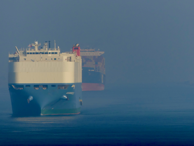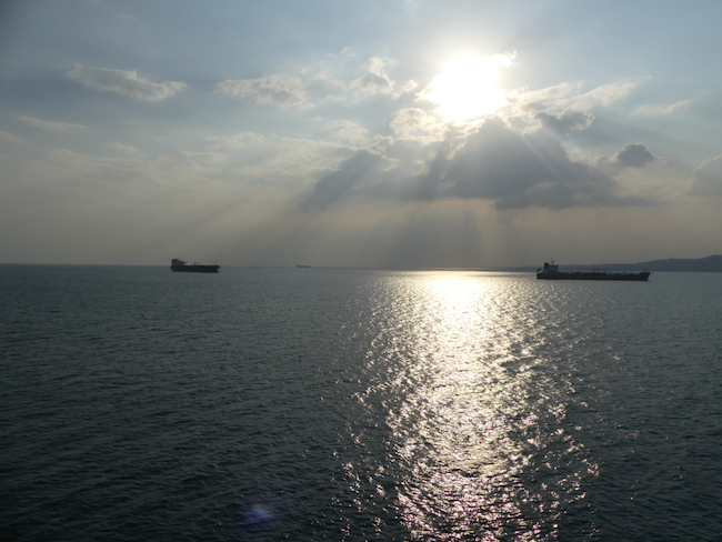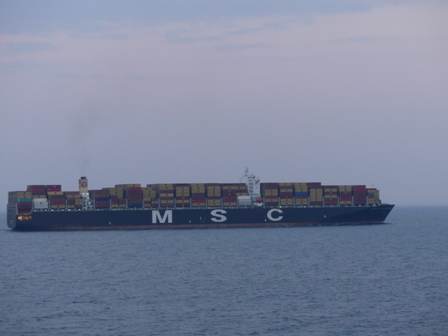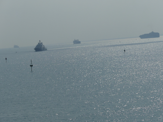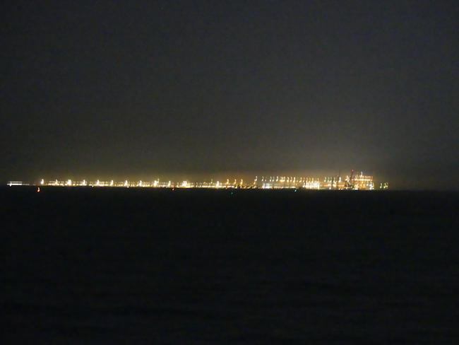 We are surrounded by cargo ships, so many ships I worry we might run into one another, all crowded together.