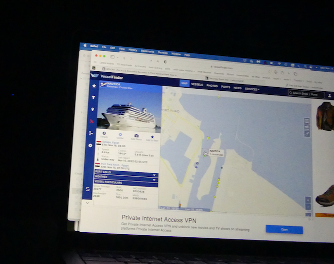 We came back to our room, changed and went up to the spa for almost an hour. Caught up on e-mail, caught up on some reading, watching the progress as he get closer to Port Said, the entry to the canal experience.