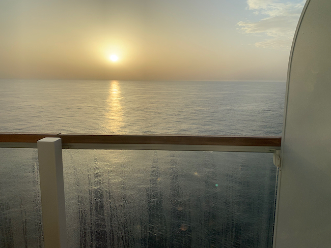 And, of course, on the first morning in a week that I could sleep in, I have adjusted to local time and I am wide awake at 5 a.m. when I normally get up to swim. There is NO ONE else up at 5 a.m. except the people who make coffee, thank God, and are busy getting breakfast ready. I had the Explorer Lounge all to myself for the first hour while I caught up on my Lectionary readings, my e-mails, and the news. And captured the rising sun 😊.