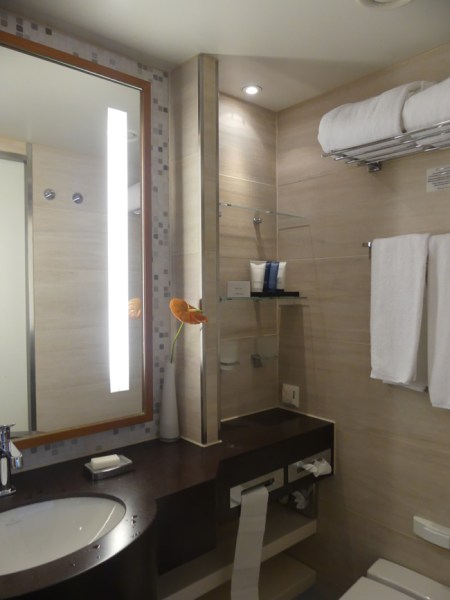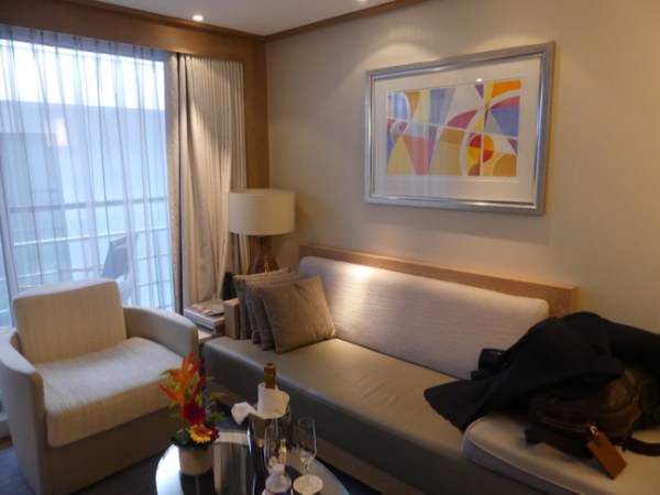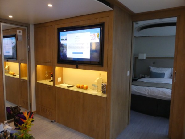 We booked a suite on the Forseti. When we walked in the door, I gasped. It was small! It was two rooms, three if you count the tiny bathroom. You entered into a sitting room, with a couch and chair and flat TV on the wall over a counter space for wine or fruits or books. It’s the size of a normal small cabin minus the part which is our balcony, which we really wanted so we could sit out on it while we cruise up the rivers.