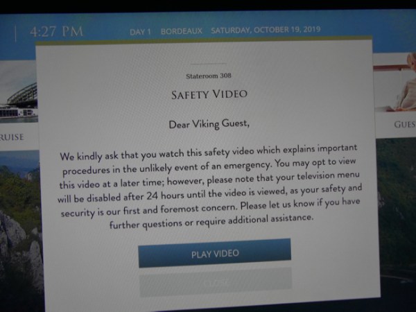 Watching the safety video is a requirement. So we watch it, and check to make sure our life vests are stowed where we can get to them. There will be a drill the next day in Cadillac.