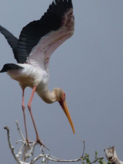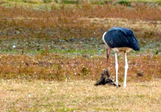 On our way back to Tena Tena, we pass through “The Colony” where the Yellow Billed Storks are nesting, hatching their young and teaching them how to fly. It is noisy, and hilarious; there is a lot going on. We particularly love the ‘flight school’ as young stork hesitate to take off, then practice their take offs and landings. Occasionally, one doesn’t make it, and there are Marabou Storks on the ground, who finish them off quickly.