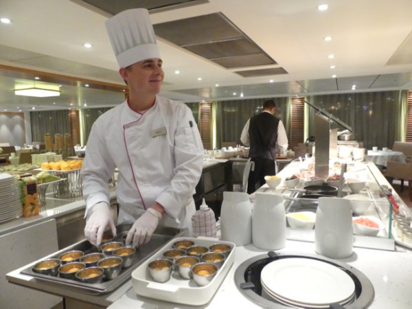 For me, I am delighted every day to find smoked salmon or herring, just thrills my little Scandinavian heart. People always ask “Don’t you gain weight on these cruises?” and I say “No” because there is a secret. Many of the portions are tiny, just a taste, to prevent waste. Usually the small taste is enough for me. With all the walking we do, I actually lose weight on these trips, in spite of some truly fine eating.