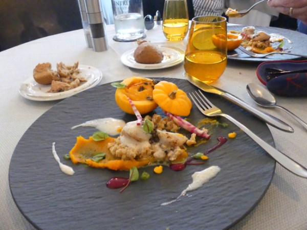 Our guide to the Domaine de Rayne had eaten there on the previous Sunday, and told us about the scallops and little pumpkins, which we ordered for the first course. This was my favorite part of the meal. I love scallops. I love pumpkin. What a fabulous combination.