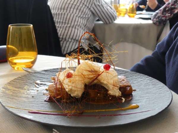 The desserts were all about the presentation. They were wrapped in caccoons of caramelized sugar strands. My husband had a Tarte Tatin (an apple pie that is cooked upside down)