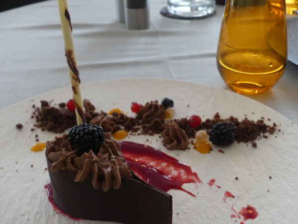 I had a chocolate ganache with a raspberry coulis – delicious. We were both very happy with our first totally French meal in France. I saw that because although we are in France, all the people working on the Forseti are from somewhere else, not France. The cruise director, Jorge, is from Portugal, others are from Romania, Spain, Bulgaria, Austria – from anywhere but France. No one speaks French on board!