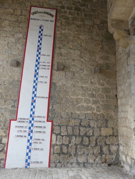 After lunch, we take a walk around Cadillac. Here, in the old tower, is a chart of where the river has risen during winter and spring storms. We have the same kinds of charts in Pensacola, thanks to hurricanes and water surges, so we understand, but this one measures over centuries. We are greatly impressed.