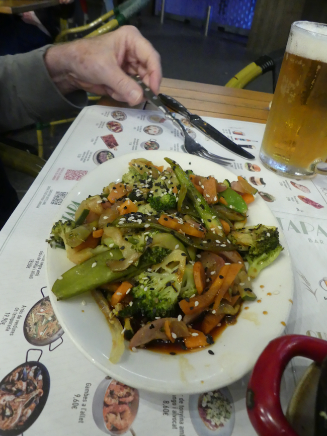 A couple blocks up, near the Gaudi house, we found Tapa Tapa, and what hooked us was they had pictures of the tapas. I ordered mussels, my husband ordered stir-fried vegetables, both were delicious (we shared) and light. By the time we walked back, we had done almost 14K steps.