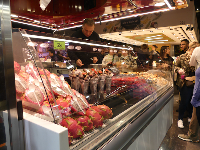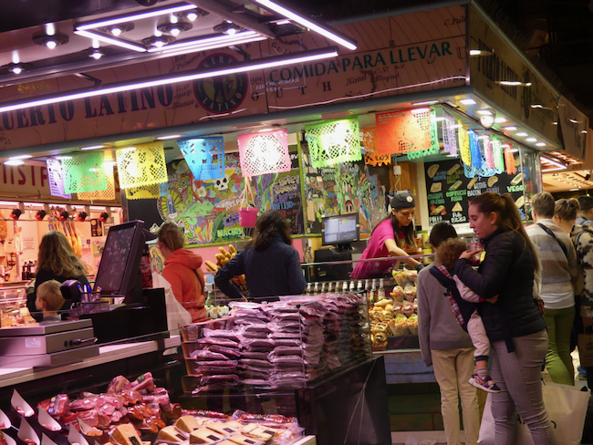 Last time we were in Barcelona, we had grabbed empanadas at the Boqueria, along with fruit drinks, and AdventureMan wanted a particular spicy beef empanada we had the last time. We darted up and down the aisles until we found the exact shop, and both bought spicy beef enpanadas, and fruit drinks, then found a place to sit at the little plaza behine the Boqueria to eat in peace, except for the pigeons.