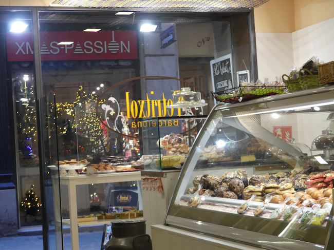 We ate lightly so that we could have hot chocolate at the oldest chocolate shop in Barcelona, very close to the Boqueria. The name is La Granja, and it is a couple streets behind La Rambla and the Boqueria.