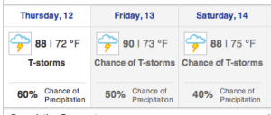 It’s not a cold rain, it’s a hot rain, the rain falls and the temperatures are in the 90’s, falling to the high 80’s. We are planning to go out to the beach to watch the big practice on Friday (we do not plan to go for the full show on Saturday! Maybe someday when we can book a hotel room for that time) hoping the beach breezes keep the mosquitos at bay. Thundershowers are forecast for the entire week, through Saturday, but, when they come, they don’t last too long, an hour at most, and then the air is clear and clean. Not crisp, but clear and clean and HUMID!