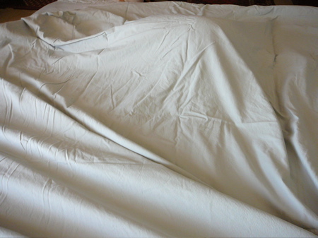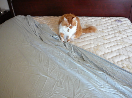 Slowly, I put the first corner on the bed, and move to the second, but it is too late. Although dead in sleep, the Qatteri Cat has detected the sound of sheets, and has made a bee-line for the bedroom.
