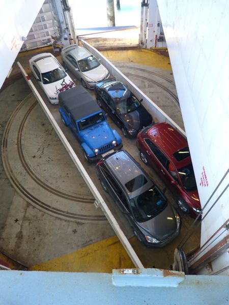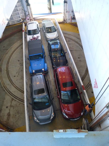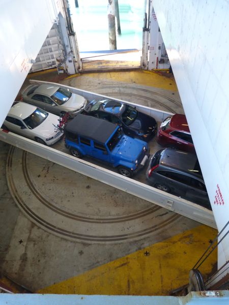“As soon as possible” can take a long long time when you are boarding cars, motorcycles, even a grown-up tricycle, container vans, campers, R/vs of all shapes and sizes, trucks, and today we learn how it is done. This is truly a marvel of engineering. It must also take some amazing system to keep straight where every vehicle needs to go because they are getting off at different stops, so all the ones getting off at the same stop need to be stored together. Watching all this happen is amazing.