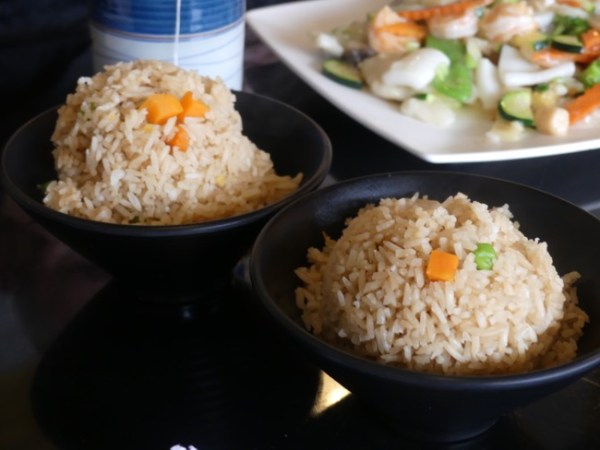 We ordered fried egg rolls, and AdventureMan ordered the Seafood Three Delights, and I ordered my all time favorite Chong Qing Spicy Chicken.