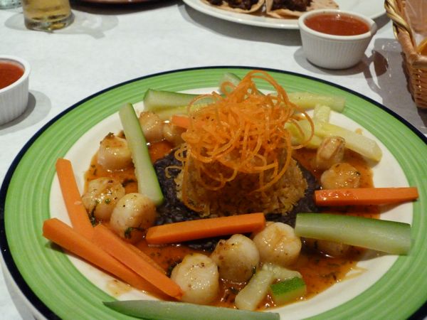 I ordered the Chili Seared Scallops. They were beautiful, and tasty, and surrounded by lovely vegetables, so I felt doubly good, eating tasty scallops AND vegetables. I was just a tiny bit taken aback that the chili sauce was sweet, so it reminded me a little of Thai food; I think I would prefer them sharp and salty, rather than sweet. They were, however, beautiful and delicious.