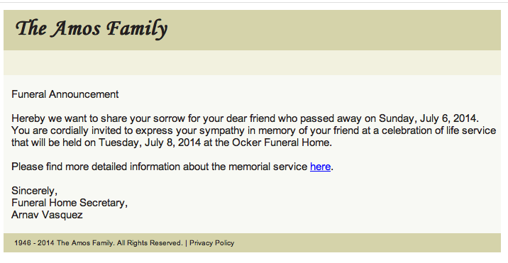 Today I got this. It’s a common name; it’s entirely possible I know someone of that name, but I have never seen a notice like this, official, impersonal, and not mentioning the specific name of the deceased. It smells. No. It stinks.