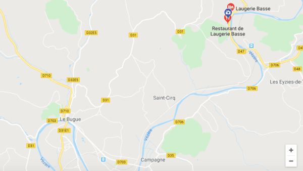 In one of Martin Walker’s books, Bruno and his friends gather for a wedding feast at L’Augerie Basse, a restaurant built into a cave in the side of a mountain. You have a short hike to get there, but oh, what fun. (I want you to see where L’Augerie Basse is, and where it is in relation to Les Eyzies and Le Bugue)