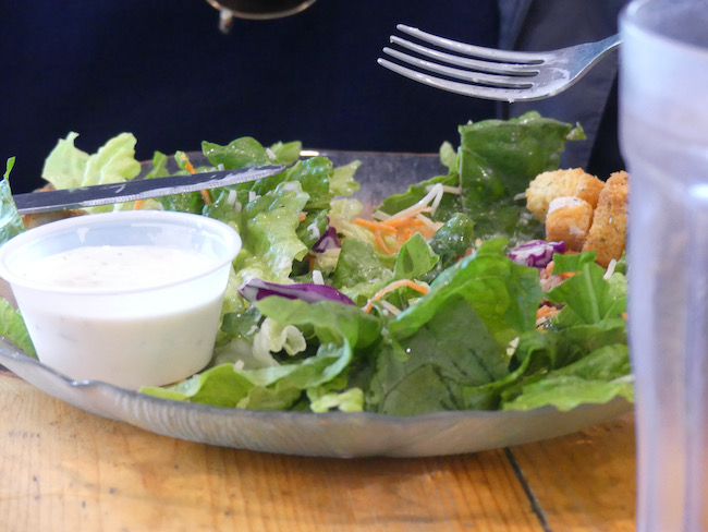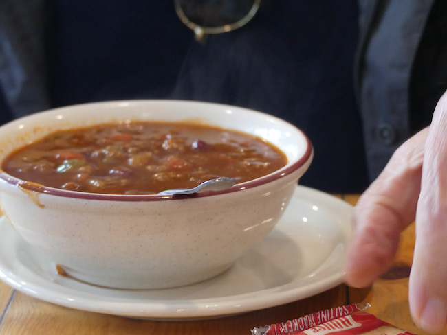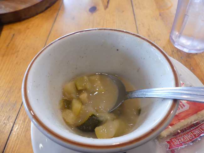 I had a zucchini soup that knocked my socks off. I ordered the salmon dinner (you can take the girl out of Alaska, but you can’t take the Alaska out of the girl) which turned out to have a LOT of food – corn on the cob, rice, and a baked potato. After the soup, which was really really good, I could only eat a little of the salmon, so I took the rest with me in a box to warm up for dinner. AdventureMan had a salad and chili, and he ordered a stuffed baked potato to-go which he could warm up for dinner. Their stuffed baked potatoes had a whole menu of items to choose from; AdventureMan choose chili, cheese and sour cream and couldn’t finish it at dinner.