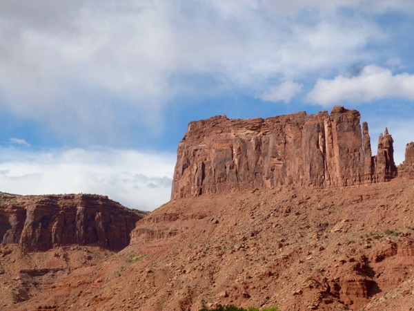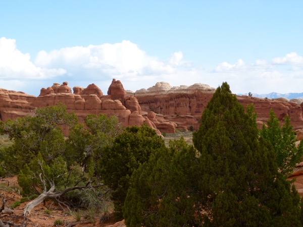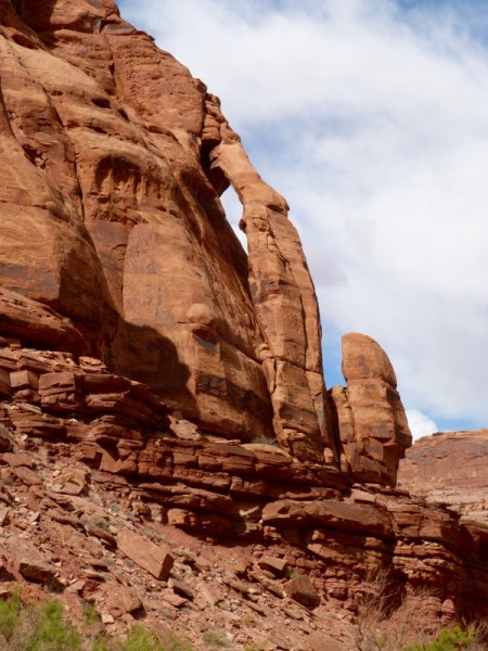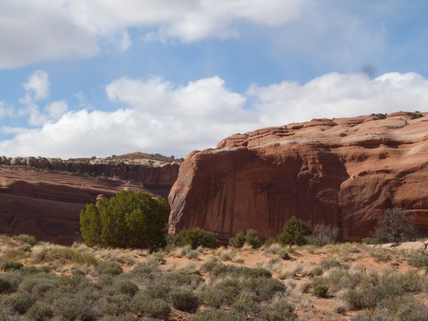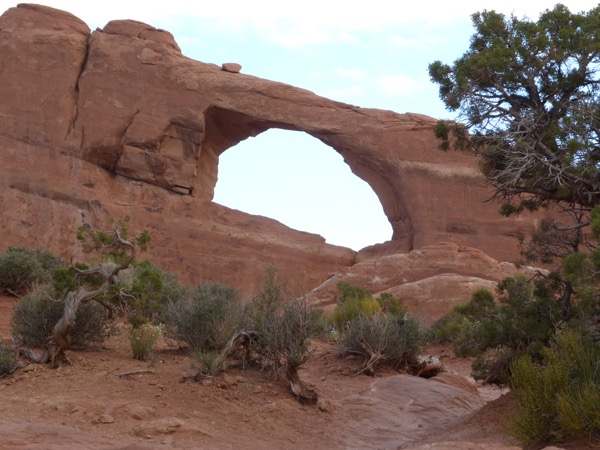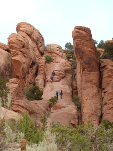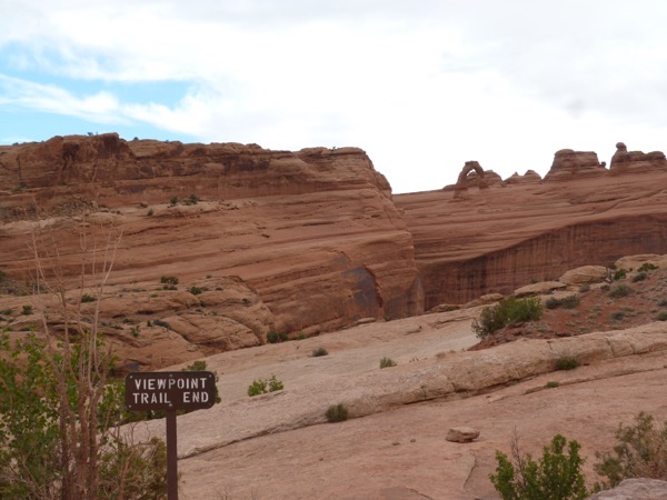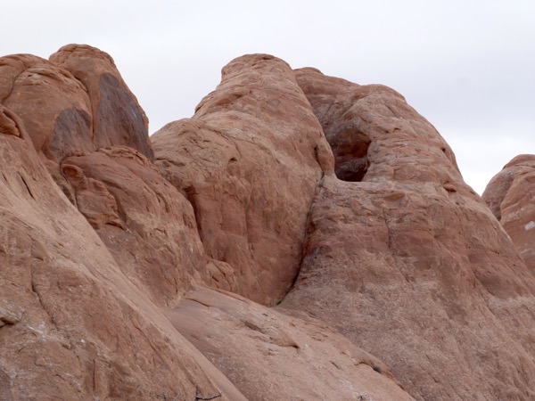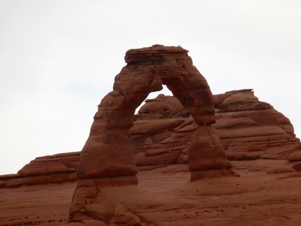 There are three ways to see Delicate Arch. One is a long hike across a marsh and then up a rock mountain. We didn’t do that. Another is a short, easy walk to a viewpoint where you can see Delicate Arch way off in the distance. The third way is a hike up a steep path, mostly rock. We took the third way, and by the time we reached the top, I was gasping. I stay pretty fit, but the altitude kicked me; and I felt like a fish, gasping for air. I would love to say that it was so beautiful, it was worth it, but actually, the light was flat, we had early morning clouds and no sunlight, so it was a little disappointing.