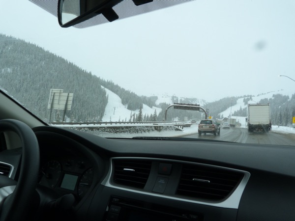 The sights of snow, truckers putting on heavy chains, and then a big sign that tells us the tunnel is blocked due to an accident, none of these are good signs. Our rental car is low to the ground, and not heavy. We watch the temperature drop as we rise higher, and tell ourselves this is the beginning of a great adventure, and every adventure entails a little risk, it adds spice. Right?