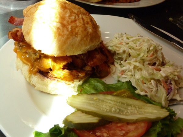 Very quickly our meals arrived. AdventureMan ordered a barbecued pork sandwich with a side of baked beans. He said it was as good as anything we have eaten in the South, very tasty.