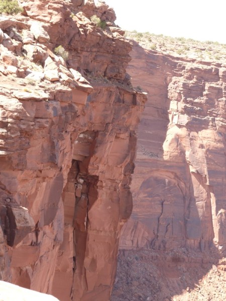 First, the road follows the Colorado River flowing along swiftly, full of rafters and boaters. Then you come to the cliffs about 5 miles in which are used by the climbing and rappelling schools to teach rock climbing, and there must have been fifty separate people working their way up and down the cliffs. This is not for the weak in body; we saw one dazed and damaged young man being loaded into an emergency vehicle for transport back to the hospital. Just past the rock climbers is the first set of petroglyphs, which are really hard to spot, about 20 feet off the ground, but once you get the hang of it, you start spotting them everywhere.
