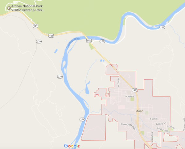The Colorado River parallels Potash Road, which is in the foreground.