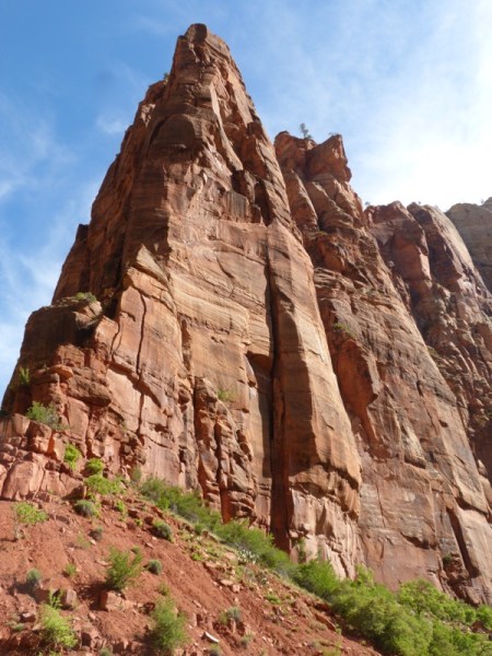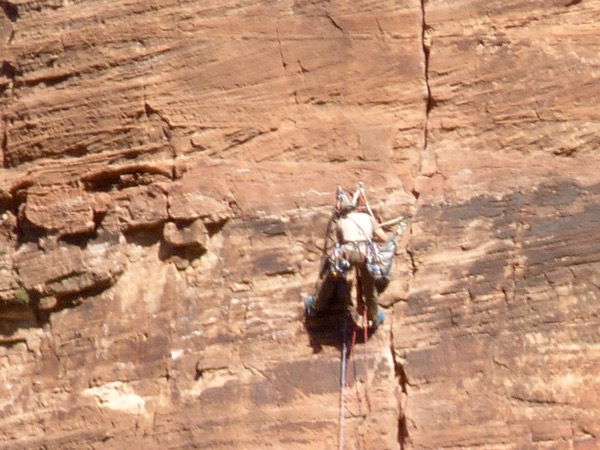 We think this is one of the park employees, creating safe climbing areas for those who like to go straight up, using ropes and pitons and you know, climbing stuff.