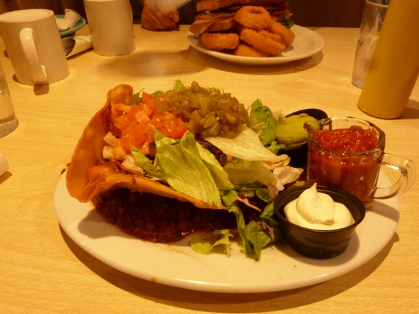 Taco Salad for me. Very different, lots of peppers, lots of salsa. Very tasty, not a lot of beans or meat.
