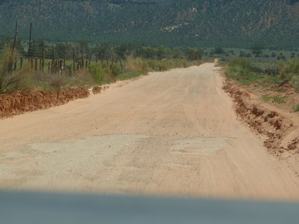 He has shown me the road on the map, and we THINK we can make it, but his rental is a little low to the ground. I notice that the road number obscures the fact that for four miles, going into Arizona, the road is actually a track. We hold our breath, as the pavement ends, the road turns into washboard, the road forms crevasses, and we just hope the road doesn’t wash away. This is one of the longest four miles ever.