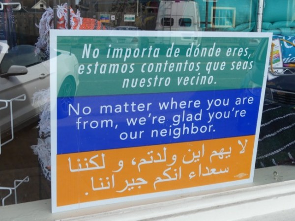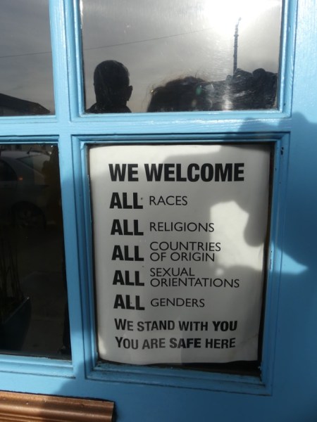 This was in the window of the main grocery/hardware/sundries store in Mendocino. When a woman saw me taking a photo, she asked me why, and I told her, it made me feel welcome and filled my heart with joy to know that it specifically would also make my Arab / Muslim friends feel welcome. She smiled, sternly, and said that they welcome ALL people, that is what California is all about. I was happily chastened. 🙂