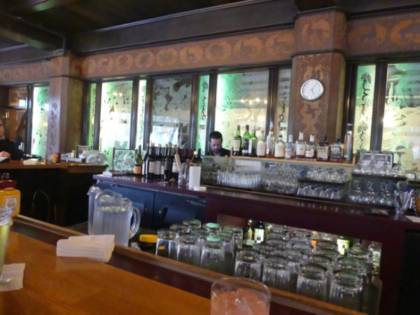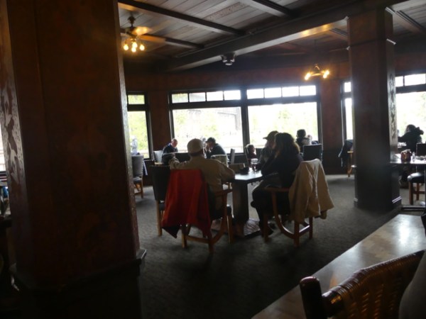 The Bear Pit Lounge is a bar that serves food. It seemed odd to me – it was a large space, with few tables, mostly for six people. Not much food, a few items. We thought we would try the bison burger, in honor of being in Yellowstone. It took a loooonnngggg time to get there. The fries were cold. The bison burger was ok.