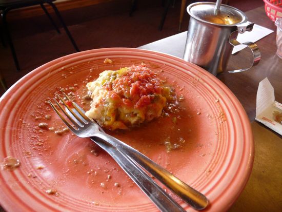 Yes. I am so embarrassed. This is what is left of the sopapilla I ordered. It was SO delicious. I had never had a stuffed sopapilla before. I had heard some Mexican guys order sopapilla the day before, so I thought I would try one. When it got to the table, I forgot to photograph before eating. Oops. My bad.