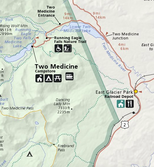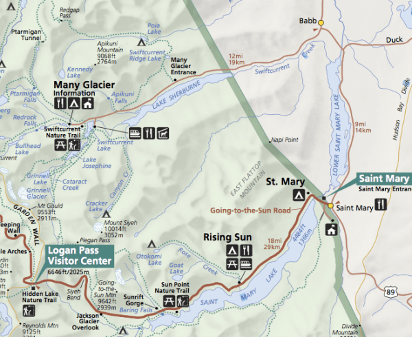 Map into Many Glacier and Road-to-the-Sun from East Entrance at St. Mary: